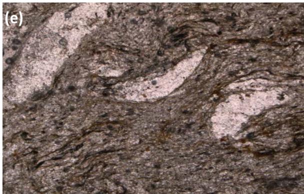 b. This specimen contains Muscovite, Biotite and Quartz and other opaque minerals with schistose structure and metamorphic origin. the dye of the specimen is white. (Figure e,f)
