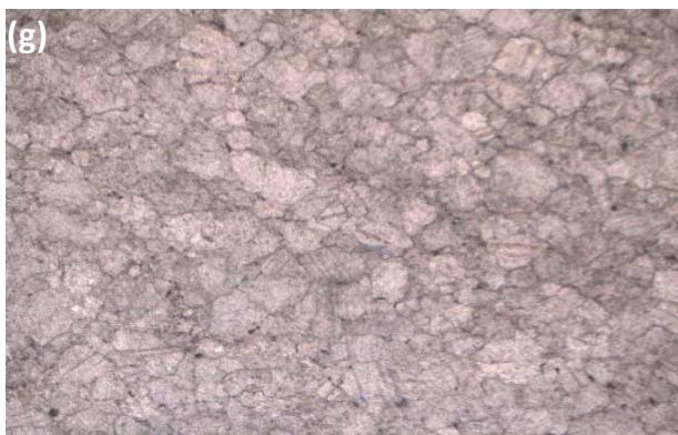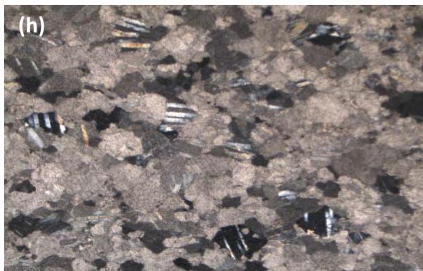 Figure 2: Microscopic Images; (a) Marble PPL and (b)Marble XPL from C1.1; (c) Mica schist PPL and (d) Mica Schist XPL, from C2.2 sample; (e) Mica schist PPL and (f) Mica Schist XPL from sampleC3.1; (g) Calcite Marble PPL and (h)Calcite Marble XPL, from sample C4.1