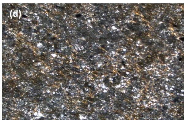 This specimen contains Calcite, Dolomite and Plagioclase with mosaic structure and metamorphic origin. The dye of the specimen is whitish yellow. (figure a,b) a. This specimen contains Muscovite, Biotite Garnet and Quartz with schistose structure and metamorphic origin. the dye of the specimen is yellowish. (Figure c,d)