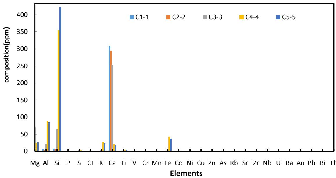 <table><tr><td>Elements</td><td>C1-1</td><td>C2-2</td><td>C3-3</td><td>C4-4</td><td>C5-5</td><td>Total PPM</td><td>Percentage</td></tr><tr><td>Mg</td><td>74,800.77</td><td>77,900.74</td><td>71,572.86</td><td>24,441.58</td><td>25,202.99</td><td>273,918.94</td><td>27.3919</td></tr><tr><td>Al</td><td>5,185.39</td><td>3,407.12</td><td>21,601.21</td><td>87,284.29</td><td>86,314.42</td><td>203,792.42</td><td>20.3792</td></tr><tr><td>Si</td><td>7,157.32</td><td>5,555.08</td><td>65,119.97</td><td>354,626.59</td><td>422,343.56</td><td>854,802.53</td><td>85.4803</td></tr><tr><td>P</td><td>0</td><td>0</td><td>0</td><td>1,198.75</td><td>1,516.36</td><td>2,715.11</td><td>0.2715</td></tr><tr><td>S</td><td>858.235</td><td>942.833</td><td>3,016.53</td><td>3,288.33</td><td>1,621.88</td><td>9,727.81</td><td>0.9728</td></tr><tr><td>Cl</td><td>415.01</td><td>588.91</td><td>1,069.03</td><td>672.319</td><td>520.006</td><td>3,265.27</td><td>0.3265</td></tr><tr><td>K</td><td>431.287</td><td>316.399</td><td>2,880.57</td><td>26,665.10</td><td>22,412.34</td><td>52,705.70</td><td>5.2706</td></tr><tr><td>Ca</td><td>308,337.81</td><td>294,867.13</td><td>252,940.08</td><td>19,869.96</td><td>17,621.57</td><td>893,636.55</td><td>89.3637</td></tr><tr><td>Ti</td><td>0</td><td>0</td><td>456.65</td><td>3,950.57</td><td>3,819.43</td><td>8,226.64</td><td>0.8227</td></tr><tr><td>V</td><td>0</td><td>43.459</td><td>43.082</td><td>174.223</td><td>143.756</td><td>404.52</td><td>0.0405</td></tr><tr><td>Cr</td><td>69.196</td><td>0</td><td>114.055</td><td>174.32</td><td>118.221</td><td>475.79</td><td>0.0476</td></tr><tr><td>Mn</td><td>125.522</td><td>126.257</td><td>116.608</td><td>395.57</td><td>319.658</td><td>1,083.62</td><td>0.1084</td></tr><tr><td>Fe</td><td>269.664</td><td>286.324</td><td>1,793.20</td><td>42,220.79</td><td>36,560.14</td><td>81,130.12</td><td>8.1130</td></tr><tr><td>Co</td><td>0</td><td>22.028</td><td>0</td><td>118.604</td><td>0</td><td>140.63</td><td>0.0141</td></tr><tr><td>Ni</td><td>60.83</td><td>81.547</td><td>71.589</td><td>94.3</td><td>84.973</td><td>393.24</td><td>0.0393</td></tr><tr><td>Cu</td><td>0</td><td>0</td><td>0</td><td>49.76</td><td>32.263</td><td>82.02</td><td>0.0082</td></tr><tr><td>Zn</td><td>15.56</td><td>18.8</td><td>28.204</td><td>91.311</td><td>88.923</td><td>242.80</td><td>0.0243</td></tr><tr><td>As</td><td>0</td><td>0</td><td>0</td><td>14.258</td><td>0</td><td>14.26</td><td>0.0014</td></tr><tr><td>Rb</td><td>0</td><td>0</td><td>0</td><td>55.933</td><td>52.166</td><td>108.10</td><td>0.0108</td></tr><tr><td>Sr</td><td>68.047</td><td>50.702</td><td>30.84</td><td>88.796</td><td>100.362</td><td>338.75</td><td>0.0339</td></tr><tr><td>Zr</td><td>0</td><td>0</td><td>0</td><td>201.972</td><td>178.984</td><td>380.96</td><td>0.0381</td></tr><tr><td>Nb</td><td>0</td><td>0</td><td>0</td><td>11.829</td><td>11.198</td><td>23.03</td><td>0.0023</td></tr><tr><td>U</td><td>0</td><td>7.479</td><td>0</td><td>0</td><td>0</td><td>7.48</td><td>0.0007</td></tr><tr><td>Ba</td><td>261.008</td><td>285.623</td><td>218.639</td><td>859.116</td><td>707.169</td><td>2,331.56</td><td>0.2332</td></tr><tr><td>Au</td><td>0</td><td>0</td><td>0</td><td>0</td><td>0</td><td>0.00</td><td>0.0000</td></tr><tr><td>Pb</td><td>0</td><td>9.021</td><td>0</td><td>23.296</td><td>28.11</td><td>60.43</td><td>0.0060</td></tr><tr><td>Bi</td><td>0</td><td>0</td><td>0</td><td>15.338</td><td>7.112</td><td>22.45</td><td>0.0022</td></tr><tr><td>Th</td><td>0</td><td>0</td><td>0</td><td>17.563</td><td>7.482</td><td>25.05</td><td>0.0025</td></tr></table>