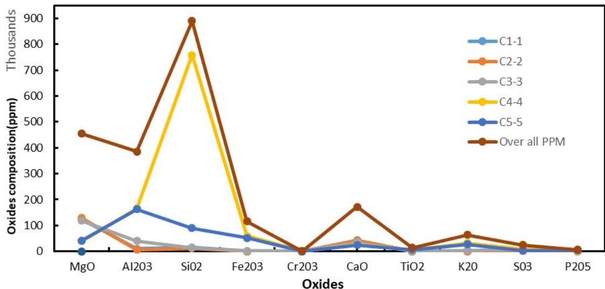 <table><tr><td>Oxides</td><td>C1-1</td><td>C2-2</td><td>C3-3</td><td>C4-4</td><td>C5-5</td><td>Over all PPM</td></tr><tr><td>MgO</td><td>124169.281</td><td>129315.227</td><td>118810.945</td><td>40573.023</td><td>41836.957</td><td>454705.433</td></tr><tr><td>Al2O3</td><td>9800.377</td><td>6439.447</td><td>40826.293</td><td>164967.313</td><td>163134.250</td><td>385167.680</td></tr><tr><td>SiO2</td><td>15316.664</td><td>11887.871</td><td>13935.673</td><td>758900.938</td><td>90381.525</td><td>890422.671</td></tr><tr><td>Fe2O3</td><td>385.620</td><td>409.443</td><td>2564.272</td><td>60375.730</td><td>52280.992</td><td>116016.057</td></tr><tr><td>Cr2O3</td><td>101.027</td><td>45.940</td><td>166.520</td><td>254.507</td><td>172.603</td><td>740.597</td></tr><tr><td>CaO</td><td>43167.294</td><td>41281.397</td><td>35411.609</td><td>27817.947</td><td>24670.201</td><td>172348.448</td></tr><tr><td>TiO2</td><td>0.000</td><td>0.000</td><td>762.605</td><td>6597.444</td><td>6378.446</td><td>13738.495</td></tr><tr><td>K2O</td><td>521.857</td><td>382.843</td><td>3485.495</td><td>32264.771</td><td>27118.930</td><td>63773.896</td></tr><tr><td>SO3</td><td>2145.588</td><td>2357.083</td><td>7541.333</td><td>8220.825</td><td>4054.696</td><td>24319.525</td></tr><tr><td>P2O5</td><td>0.000</td><td>0.000</td><td>0.000</td><td>2745.132</td><td>3472.462</td><td>6217.594</td></tr></table>