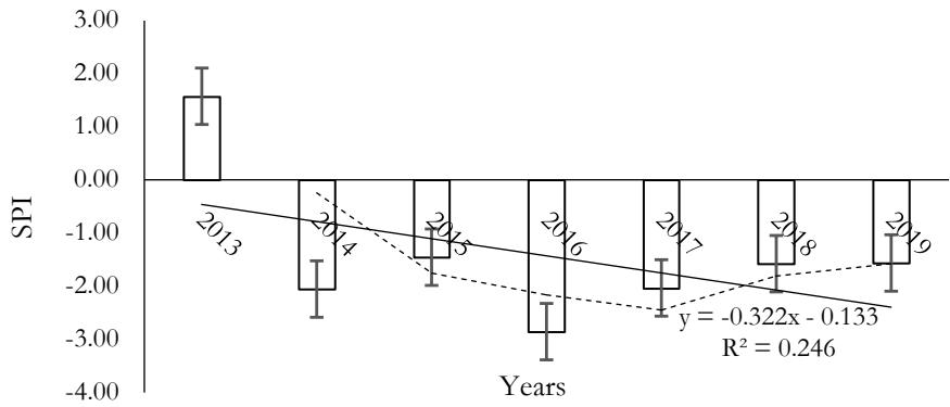 2010 (-0.50-mild dryness), 2011 (0.14-mild dryness and 2012 (-0.69-mild dryness). From 2013 to 2019, the SPI continued to decline below the average (Figure 12). It is also another dry decade.