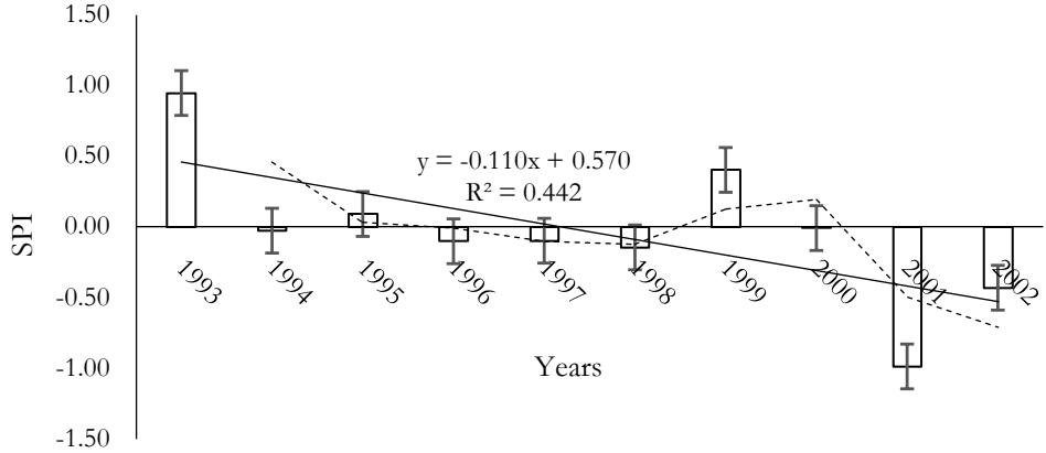In 1983, the SPI value was (-0.01-mild dryness), 1984 (0.33-mildly wet), 1985 (0.24-mildly wet), 1986 (0.26-mildly wet), 1987 (-0.63-mild dryness), 1988 (-0.39-mild dryness), 1989 (0.45-mildly wet), 1990 (0.27- mildly wet), 1991 (0-mildly wet) and 1992 (0.51-mildly wet). The 1993 to 2002 period can be seen as a dry decade, with a decreasing SPI trend and seven years of negative SPI (Figure 10).