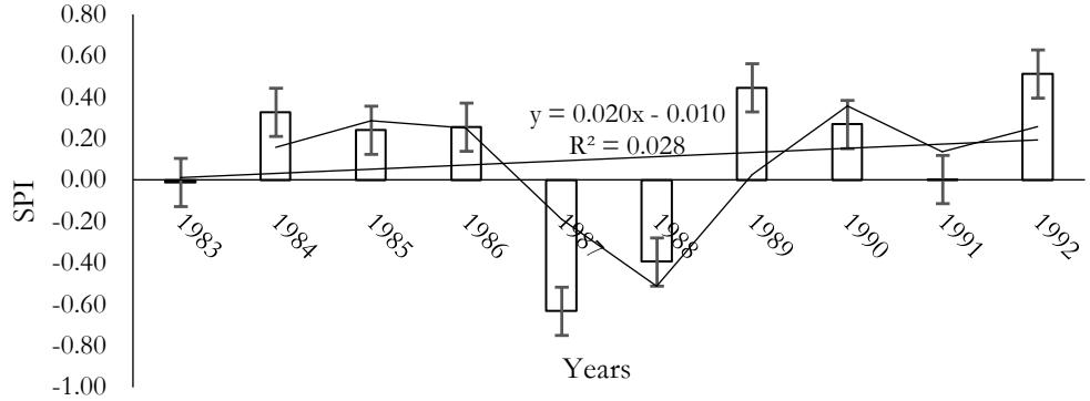 (0.86-mildly wet), 1981 (0.84-mildly wet) and 1982 (0.51-mildly wet). The SPI trend increased above the average from 1983 to 1992 (Figure 9).