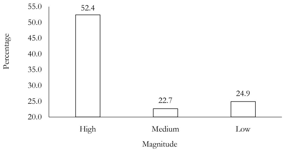 Climate change is the statistical variations in the properties of the climate system such as changes in temperatures, precipitation, and other climatic elements due to natural or human drivers over a long period. Climate change could drastically alter the distribution and quality of natural resources, thereby adversely affecting the livelihood security of the people (IPCC, 2018). The population of Bamenda III perceive that the magnitude of climate variability is high (Figure 3).