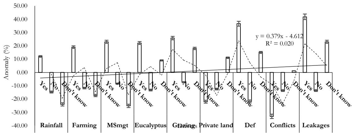 <table><tr><td>Drivers</td><td>Options</td><td>Frequency</td><td>%</td></tr><tr><td rowspan="3">Irregular/unreliable rainfall</td><td>Yes</td><td>194</td><td>72.1</td></tr><tr><td>No</td><td>50</td><td>18.6</td></tr><tr><td>Don't know</td><td>25</td><td>9.3</td></tr><tr><td rowspan="3">Farming at watersheds</td><td>Yes</td><td>168</td><td>62.5</td></tr><tr><td>No</td><td>58</td><td>21.6</td></tr><tr><td>Don't know</td><td>43</td><td>16.0</td></tr><tr><td rowspan="3">Mismanagement of water projects</td><td>Yes</td><td>180</td><td>66.9</td></tr><tr><td>No</td><td>67</td><td>24.9</td></tr><tr><td>Don't know</td><td>22</td><td>8.2</td></tr><tr><td rowspan="2">Eucalyptus plantations at watersheds</td><td>Yes</td><td>149</td><td>55.4</td></tr><tr><td>No</td><td>54</td><td>20.1</td></tr><tr><td></td><td>Don't know</td><td>66</td><td>24.5</td></tr><tr><td rowspan="3">Grazing at watersheds</td><td>Yes</td><td>159</td><td>59.1</td></tr><tr><td>No</td><td>70</td><td>26.0</td></tr><tr><td>Don't know</td><td>40</td><td>14.9</td></tr><tr><td rowspan="3">Private land ownership at the watershed</td><td>Yes</td><td>151</td><td>56.1</td></tr><tr><td>No</td><td>56</td><td>20.8</td></tr><tr><td>Don't know</td><td>62</td><td>23.0</td></tr><tr><td rowspan="3">Deforestation in the watersheds</td><td>Yes</td><td>188</td><td>69.9</td></tr><tr><td>No</td><td>31</td><td>11.5</td></tr><tr><td>Don't know</td><td>50</td><td>18.6</td></tr><tr><td rowspan="3">Conflicting land uses at the watersheds</td><td>Yes</td><td>123</td><td>45.7</td></tr><tr><td>No</td><td>53</td><td>19.7</td></tr><tr><td>Don't know</td><td>93</td><td>34.6</td></tr><tr><td rowspan="3">Irregular repairs of leakages</td><td>Yes</td><td>202</td><td>75.1</td></tr><tr><td>No</td><td>53</td><td>19.7</td></tr><tr><td>Don't know</td><td>14</td><td>5.2</td></tr></table>