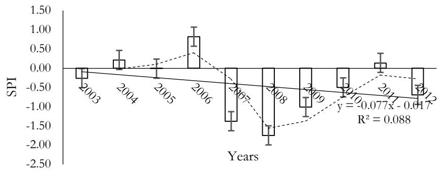 The SPI values were, 2003 (-0.26-mild dryness), 2004 (0.21-mildly dry), 2005 (-0.01-mild dryness), 2006 (0.82-mildly wet), 2007 (-1.38-moderate dryness), 2008 (-1.75-severe dryness), 2009 (-1.01-moderate dryness),