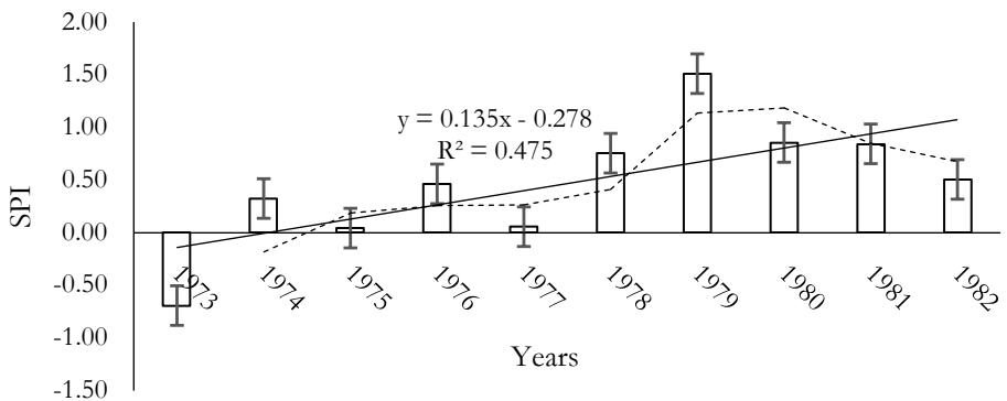 The SPI episodes were 1973 (-0.69-mild dryness), 1974 (0.32-mildly wet), 1975 (0.04-mildly wet), 1976 (0.46-mildly wet), 1977 (0.06-mildly wet), 1978 (0.75-mildly wet), 1979 (1.51-moderately wet), 1980