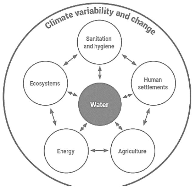 Figure 1: Interactions between water and other major socio-economic sectors affected by climate variability and change. Source: Stewart et al., 2020