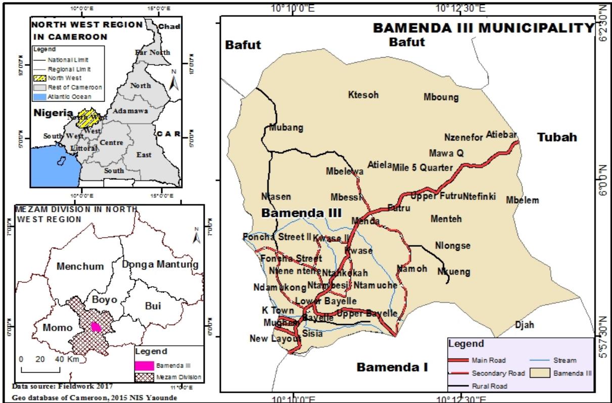 The Bamenda III Municipality is found in Mezam Division of the Northwest Region of Cameroon, located between Longitude $10^{\circ}10'0''$ and $10^{\circ}14'0''$ East of the Greenwich Meridian and Latitude $5^{\circ}56'0''$ and $6^{\circ}0'0''$ North of the Equator (Figure 2).