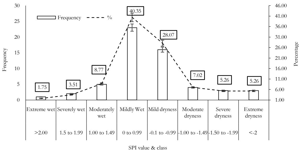 <table><tr><td>SPI Value</td><td>Category</td><td>Probability (%)</td><td>Freq. in 100 years</td><td>Severity of event</td></tr><tr><td>>2.00</td><td>Extreme wet</td><td>2.3</td><td>100</td><td>1 in 1 year</td></tr><tr><td>1.5 to 1.99</td><td>Severely wet</td><td>4.4</td><td>70</td><td>1 in 1.1 years</td></tr><tr><td>1.00 to 1.49</td><td>Moderately wet</td><td>9.2</td><td>50</td><td>1 in 1.3 years</td></tr><tr><td>0 to 0.99</td><td>Mildly Wet</td><td>34.1</td><td>45</td><td>1 in 1.5 years</td></tr><tr><td>-0.1 to -0.99</td><td>Mild dryness</td><td>34.1</td><td>33</td><td>1 in 3 years</td></tr><tr><td>-1.00 to -1.49</td><td>Moderate dryness</td><td>9.2</td><td>10</td><td>1 in 10 years</td></tr><tr><td>-1.50 to -1.99</td><td>Severe dryness</td><td>4.4</td><td>5</td><td>1 in 20 years</td></tr><tr><td><-2</td><td>Extreme dryness</td><td>2.3</td><td>2.5</td><td>1 in 50 years</td></tr></table>