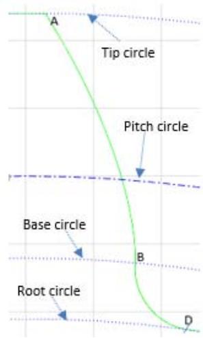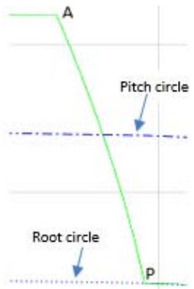 In this particular case, the root radius is greater than the base radius and the tooth profile consists only of the involute part and top part.