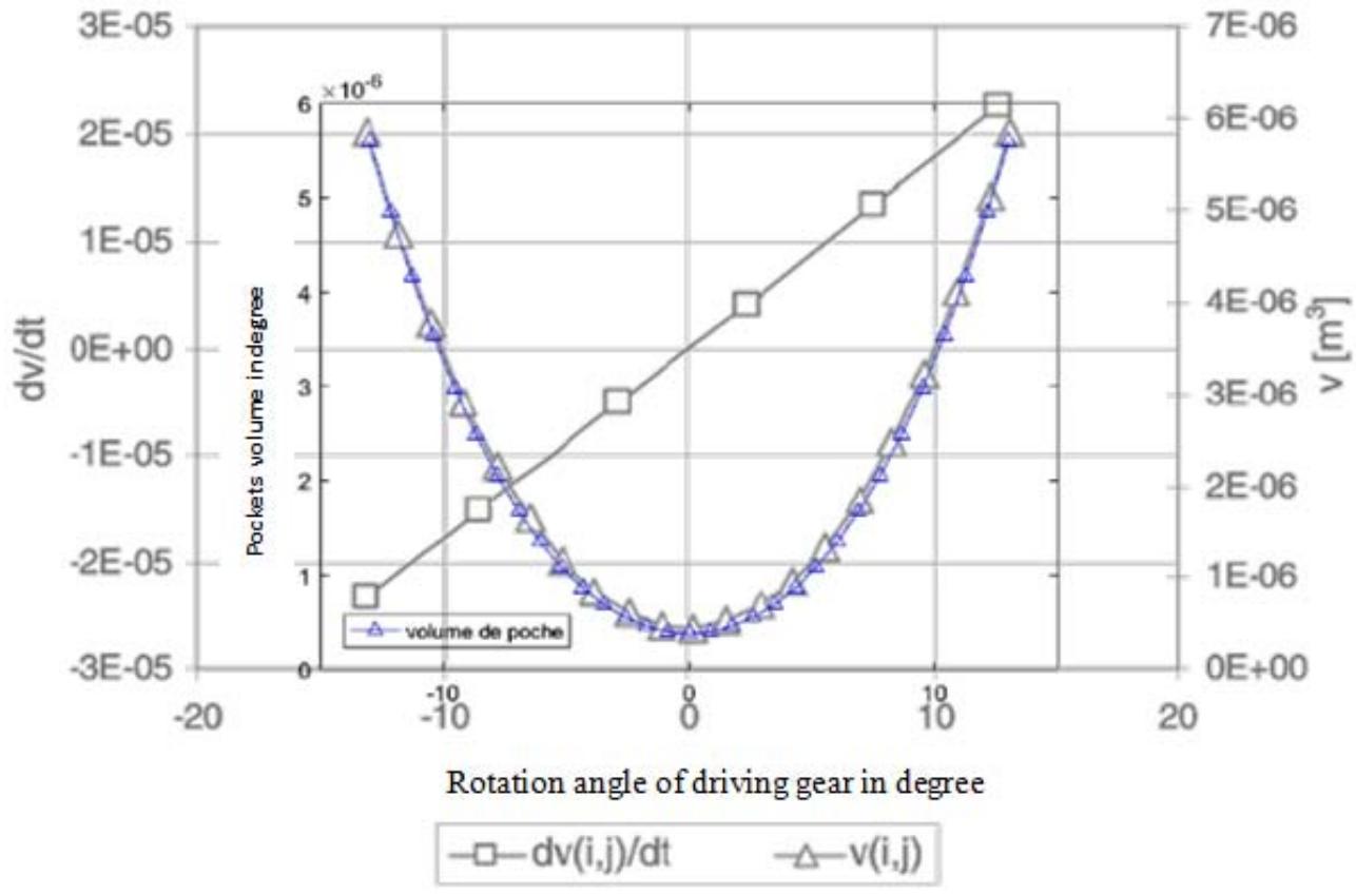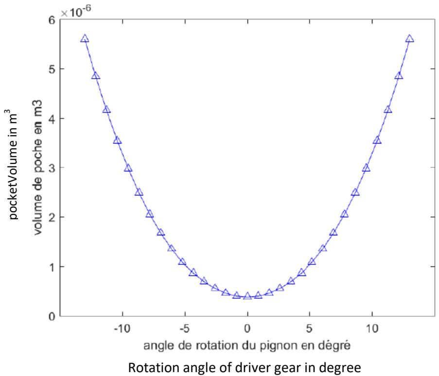 The result of our model for calculating the pockets volumes corresponding to the gearing system of table 2 has generated the curve of figure 12 below. This figure gives the evolution of the pockets volumes (axial leakage surface multiplied by the tooth width) as a function of the angle of rotation of the driver gear on the interval $[-13^{\circ}, 13^{\circ}]$.