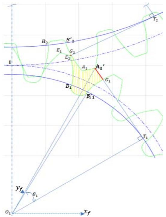 In our calculations, the initial position is the position where the tooth profiles of the driving and driven gears meet at point I (the contact point between the pitch circles).
