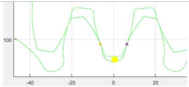 Figure 9: Detailed view of the half of the tooth of gear 2 in table 1. Here, $= 187.9385 \mathrm{~mm}$; $= 185.5 \mathrm{~mm}$