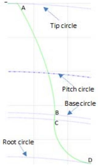 - The portion of tooth between the addendum circle and the base circle is in involute.