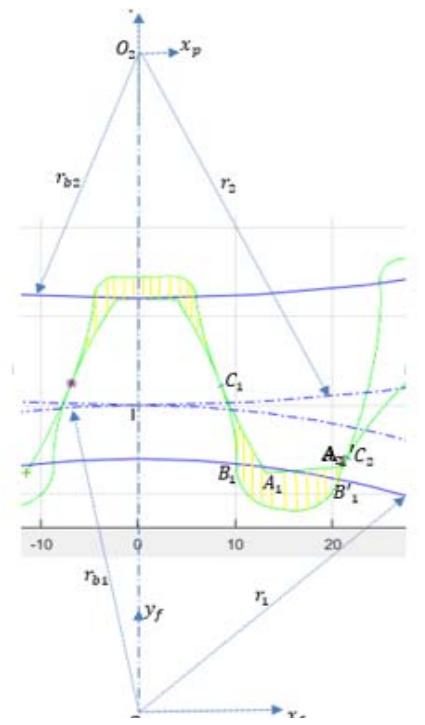 In a specific interval of the rotation angle, the profiles of the teeth meet, and consequently the radial leakage surfaces remain zero. Figure 5 below is a particular case. On this figure, C1 and C2 are the two contact points of the tooth profiles.