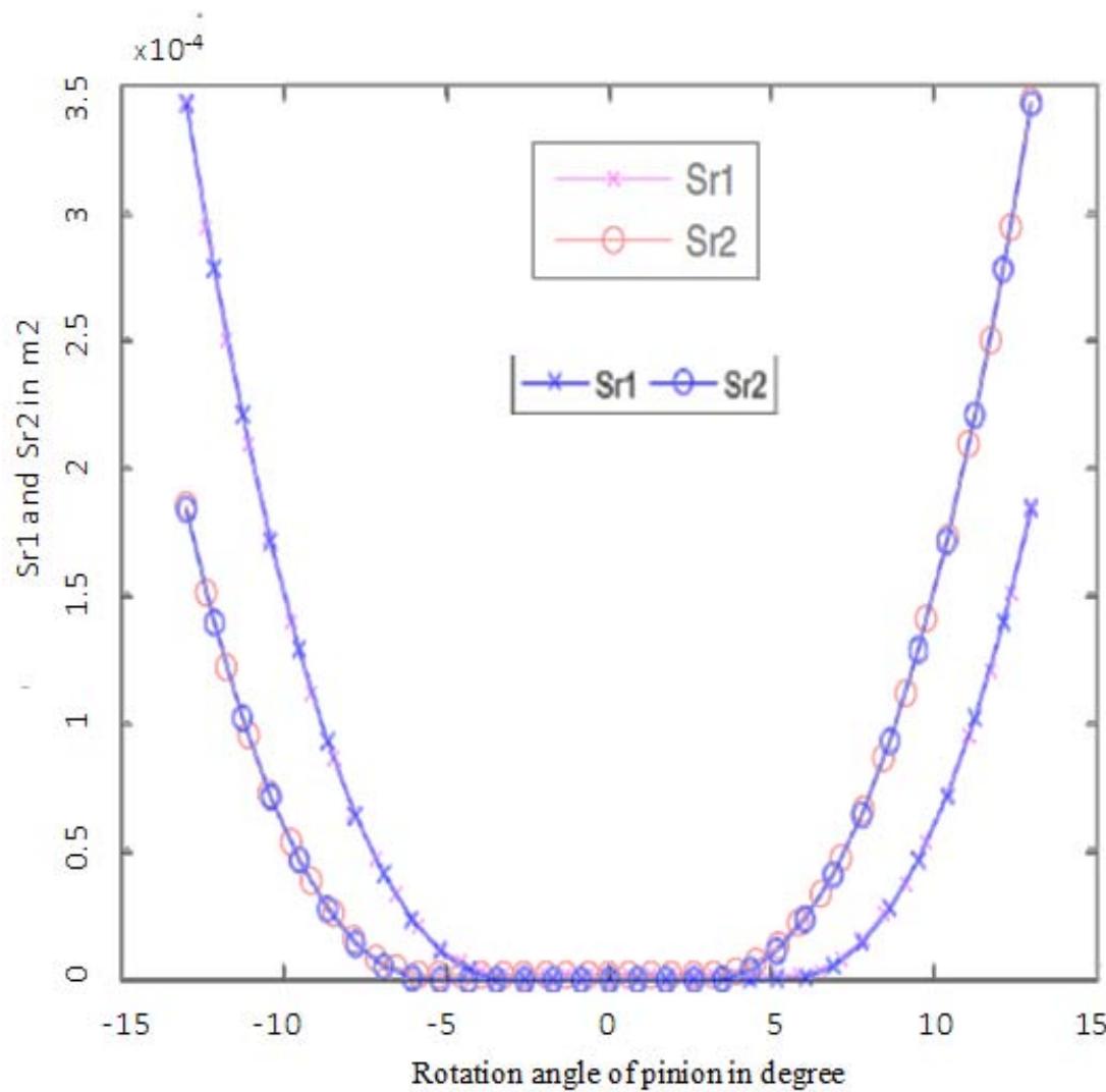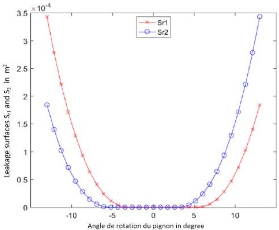 The application of our model for calculating of the radial leakage surfaces 1 and 2 relative to the gear of table 2 has generated the curves of figure 11 below. This figure gives the evolution of the radial leakage surfaces $(S_{r1}$ and $S_{r2})$ as a function of the rotation angle of the drive gear on the interval $[-13^{\circ}, 13^{\circ}]$.