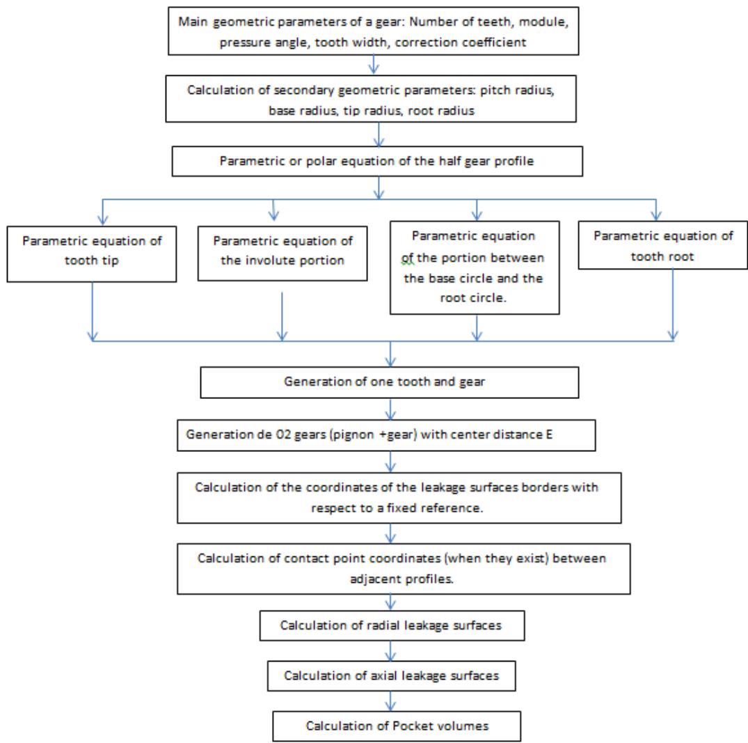 From the initial position, the coordinates of the boundary points of the leakage surfaces are calculated as a function of the rotation angle. From the properties of the involute of a circle, we calculate the radial distances as a function of the rotation angle and by surface integration, we obtain the radial surfaces. The figure 7 below is the algorithm that succinctly presents our working methodology.