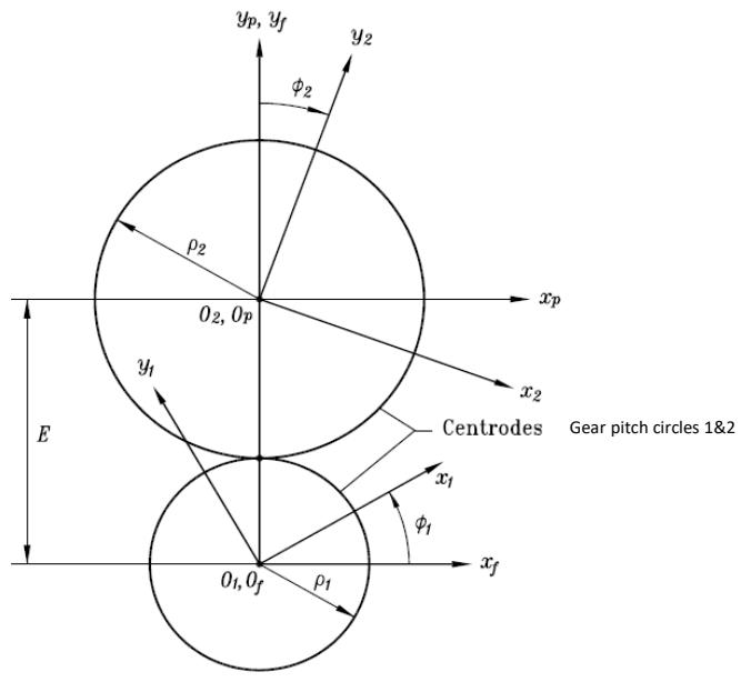 The pinion (driver) is associated to a fixed reference $(O_{f},x_{f},y_{f},z_{f})$ and mobile reference $(O_{1},x_{1},y_{1},z_{1})$, which revolves around $(O_{f},z_{f})$ by an angle $\phi_{1}$. Similarly, the gear (driven) is associated to fixed reference $(O_{p},x_{p},y_{p},z_{p})$ and mobile reference $(O_{2},x_{2},y_{2},z_{2})$, which revolves around $(O_{p},z_{p})$ by an angle $\phi_{2}$. Such as $\phi_{2} = -(\rho_{1} / \rho_{2})\phi_{1} = -(r_{1} / r_{2})\phi_{1} = -(r_{s1} / r_{s2})\phi_{1}$. Figure 3 below illustrates all these different references.