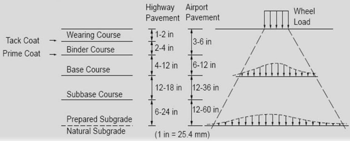 (a) Typical Cross Section of Flexible Pavement (b) Load Transmission in Flexible Pavement