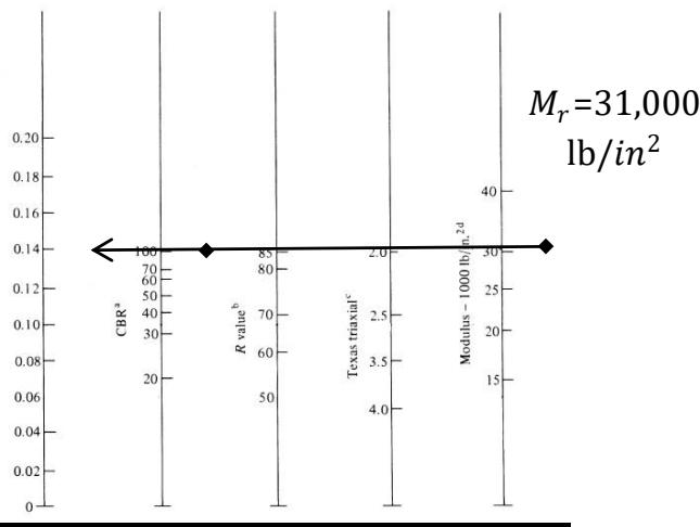 $\mathrm{M_r} = 1500^* \mathrm{CBR} = 1500^* 5 = 7500 \mathrm{lb} / \mathrm{in}^2$