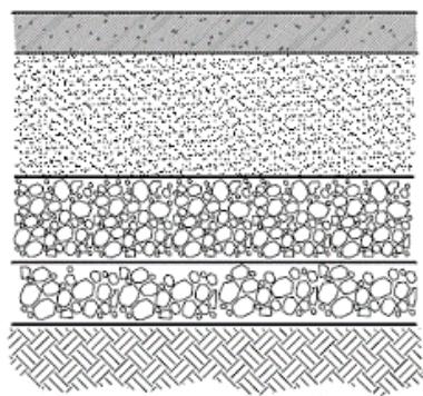 Constructed immediately above the base course, usually consists a mixture of aggregates and asphalt. It should be capable of withstanding high tire pressures, resisting abrasive forces due to traffic, providing a skid-resistant driving surface, and preventing the penetration of surface water into the underlying layers.