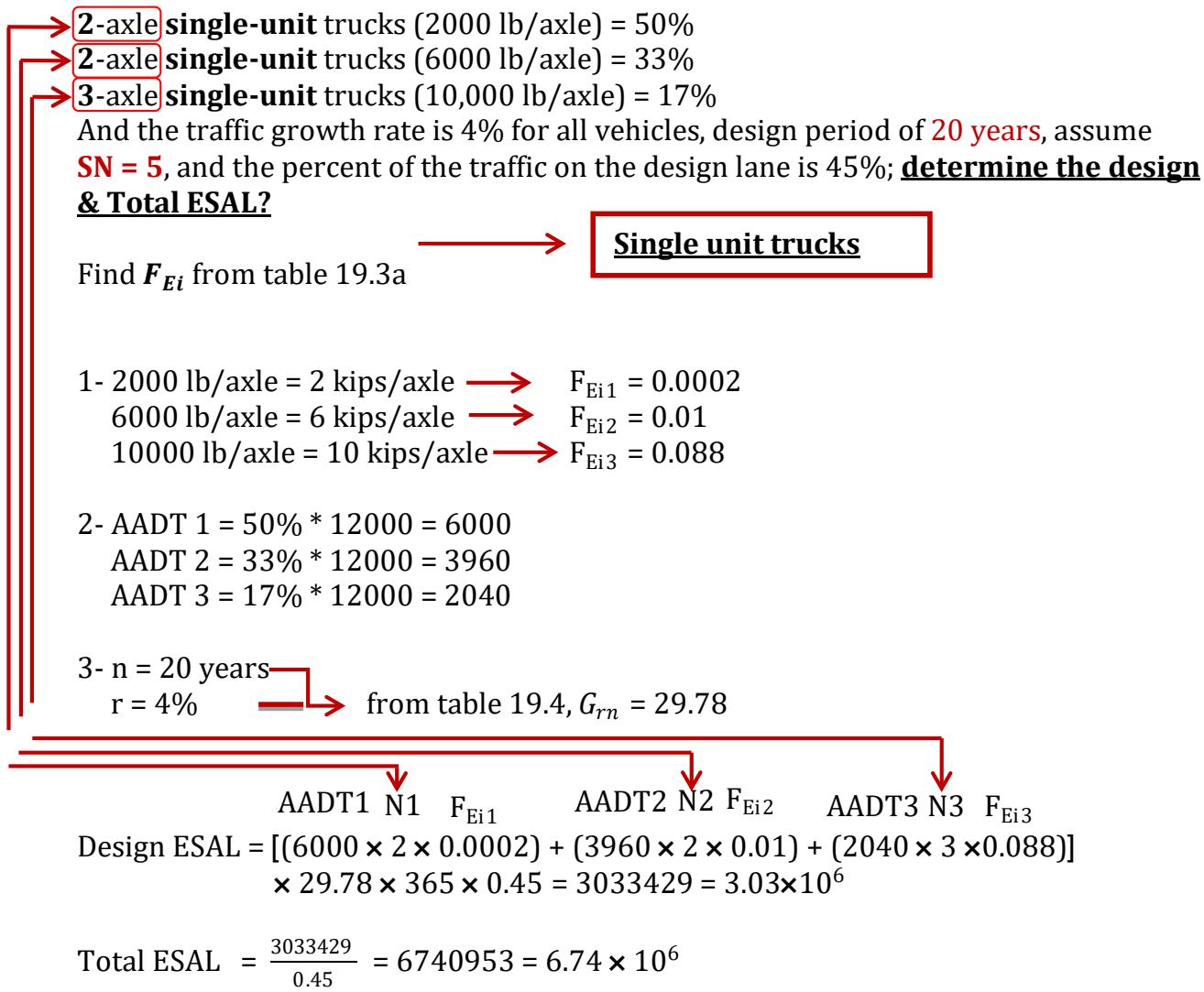 [5000 \, \text{lb/axle} = 5 \, \text{kips/axle} \longrightarrow \quad F_{\text{Ei2}} \, \text{single} = \frac{0.003 + 0.013}{2} = 0.008]
