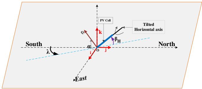 Let's $\mathbf{OQ}$ be the normal vector to the PV plane of the tracker (Figure2). Vectors $\mathbf{OQ}$ and $\mathbf{OM}$ (Vector representing the incident solar irradiance) are expressed as follows: