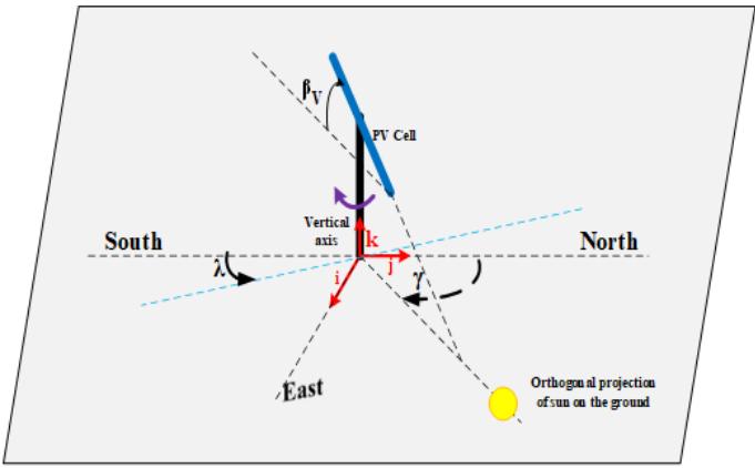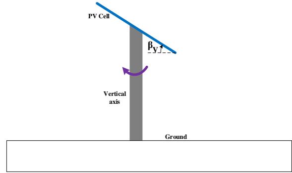 Let's consider a single axis tracker that performs rotational movement around a vertical axis according the principle that its angular rotation is locked on solar azimuth $(\gamma)$. Furthermore the PV cells array fastened on the vertical axis are assumed to be tilted with a certain inclination angle (Figure1 and FigureA2.1 of appendix2).