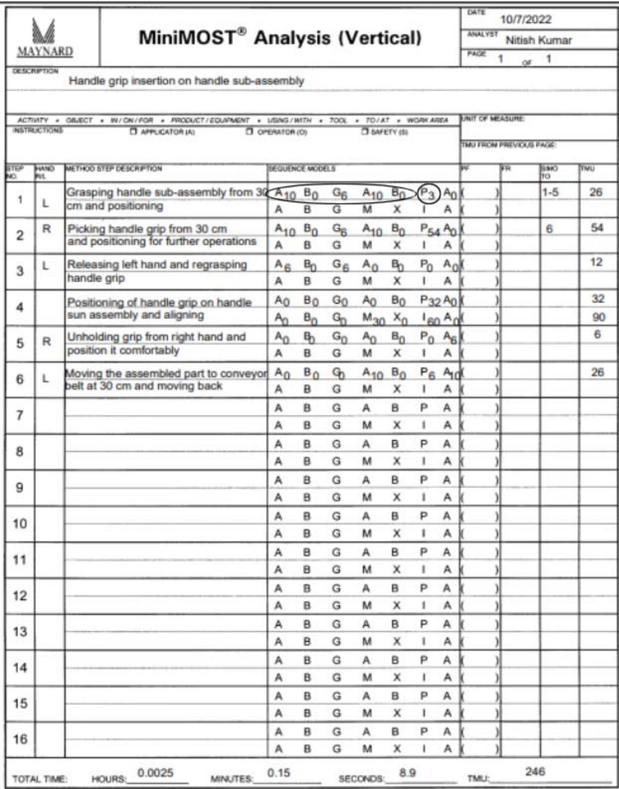 MiniMOST Analysis sheet based on the sequence of activities:-