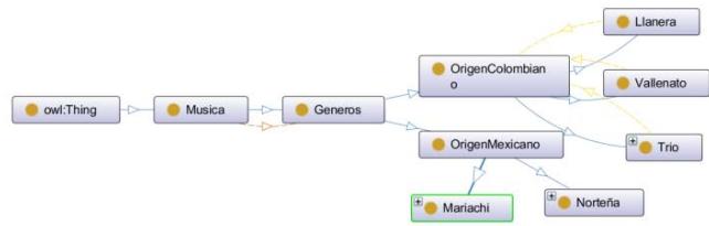 The ontology created contains the existing relationships between the groups and the musical genres to which they belong; therefore, a musical group cannot belong to two different musical genres and each musical genre can only belong to one origin, thus simplifying the ontological model, although a musical genre may have one or several shared origins.