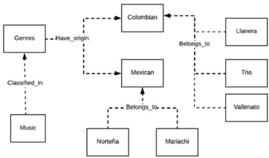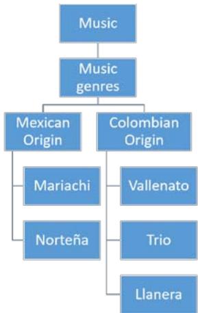 <table><tr><td>Name</td><td>Description</td></tr><tr><td>Music</td><td>Represents the concept and completion of the art.</td></tr><tr><td>Musical genres</td><td>It is the way in which the different kinds of music can be classified, according to their country of origins, instruments used, rhythm, melody or lyrics.</td></tr><tr><td>Mariachi</td><td>It is a Mexican musical genre, whose origin dates back to the XVII century, its main instruments are the trumpet, vihuela and guitarron.</td></tr><tr><td>Norteña</td><td>It is a Mexican musical genre, whose origin dates back to the 20th century, its main instruments are the bass and the accordion.</td></tr><tr><td>Vallenato</td><td>It is a Colombian musical genre; its main instrument is the accordion.</td></tr><tr><td>Trio</td><td>It is an unknown origin musical genre, its main instruments are the guitar and the voice, in the present investigation it will be assumed that it is originally from Colombia.</td></tr><tr><td>Llanera</td><td>It is a Colombian and Venezuelan musical genre, whose origin dates back to the 19th century, its main instruments are the harp and maracas.</td></tr></table>