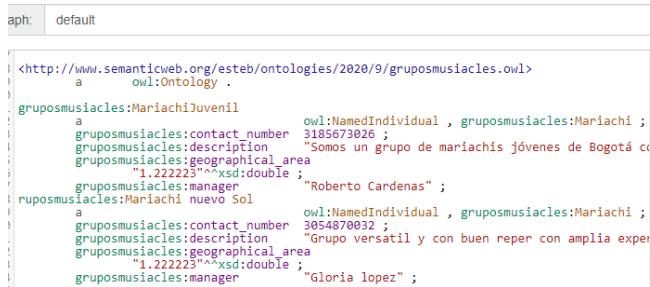 Once the ontology was developed, it was exported in OWL format, and deployed in the Apache Jena ontology server, which allows the entry of instances to the ontology created, the advantages of using this server is that it serves as an inference engine to reason about ontologies, provides compatibility of queries with different SPARQL specification and allows to persist the data in a relational base [9], this server will be responsible for storing the information of each musical group that is registered in the web portal, which will be known as a new instance, it stores information of the group such as: genre to which it belongs, description of the band, contact number, price of the service, geographic location and a manager.