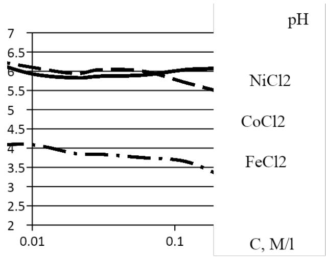Fig. 7: The dependence of the pH of solutions of $\mathrm{CoCl}_2$, $\mathrm{NiCl}_2$, $\mathrm{FeCl}_2$ on concentration C.