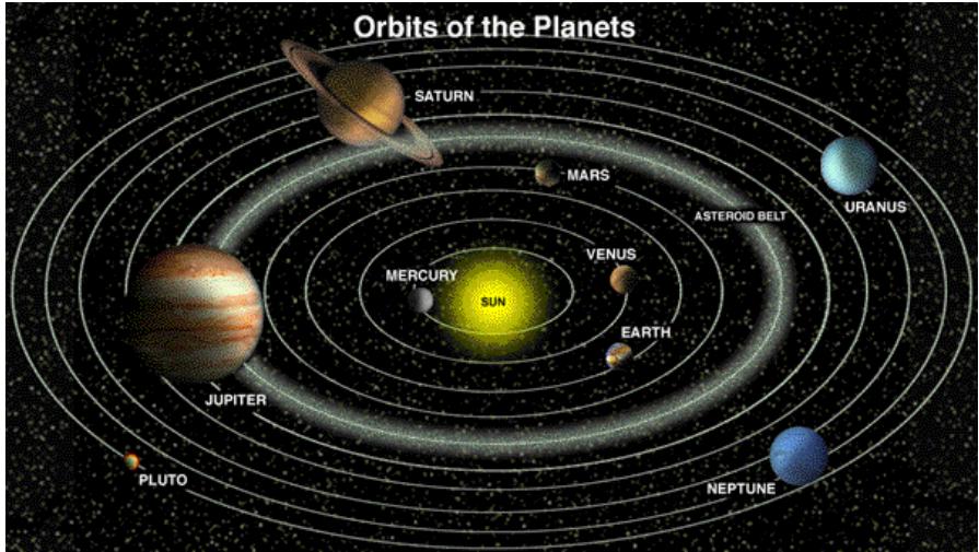 Most of the satellites of the planets, and the asteroids revolve around the Sun in the same direction, in nearly circular orbits. When looking down from above the Sun's at the North Pole, the planets orbit in a counter-clockwise direction. The planets orbit the Sun in or near the same plane, called the ecliptic. Pluto is a special case in that its orbit is the most highly inclined (18 degrees) and the most highly elliptical of all the planets. Because of this, for part of its orbit, Pluto is closer to the Sun than Neptune. The axis of rotation for most planets is nearly perpendicular to the ecliptic. The exceptions are Uranus and Pluto, which are tipped on their sides (2).