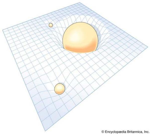 As he worked out the equations for his general theory of relativity, Einstein realized that massive objects caused a distortion in space-time. Imagine setting a large body in the center of a trampoline. The body would press down into the fabric, causing it to dimple. A marble rolled around the edge would spiral inward toward the body, pulled in much the same way that the gravity of a planet pulls at rocks in space.
