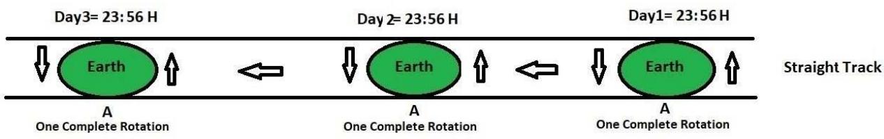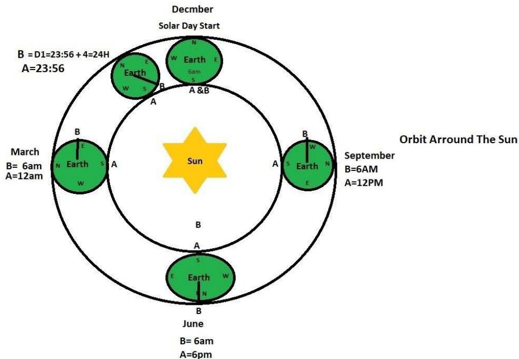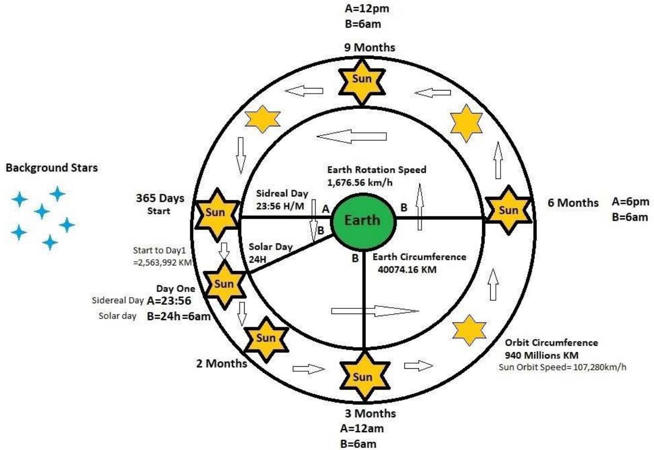 The Earth orbits the sun in 365.25 Days at speed of $107,280 \mathrm{~km/h}$, and the circumference of this orbit is 940 Million/km (9). Linking the above statistics, we realize that the earth is finishing a complete one rotation in 23 hours and 56 min, by -4 minutes every day of the length of the day, which is 24 Hours. For example, if today the sun rise at 6 am at particular location on the earth, tomorrow the sun will rise at 6 am -4 minutes at the exact place, same scenario every day by -4 min. Let's apply the explained fact in (3.1) to the heliocentric model as shown below in Figure 6.