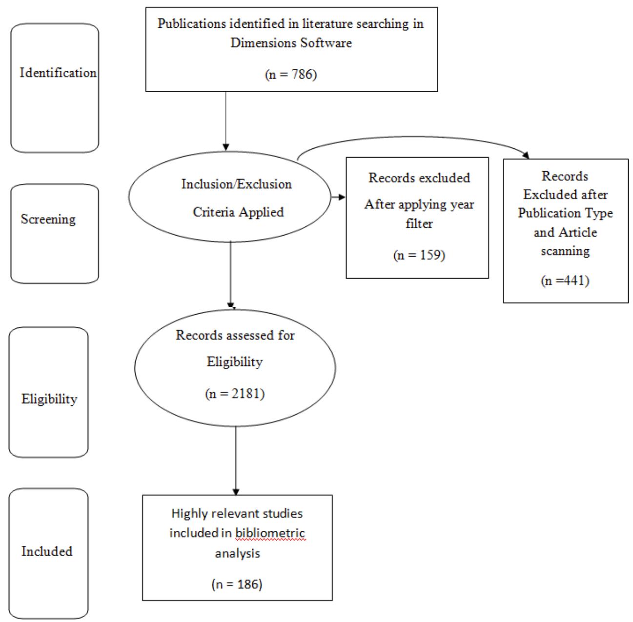 This session provides a comprehensive analysis of the bibliometric study. After sort-out, each record and screening of each bibliometric record by reading title and abstract, 186 unique records verified used for current studies.