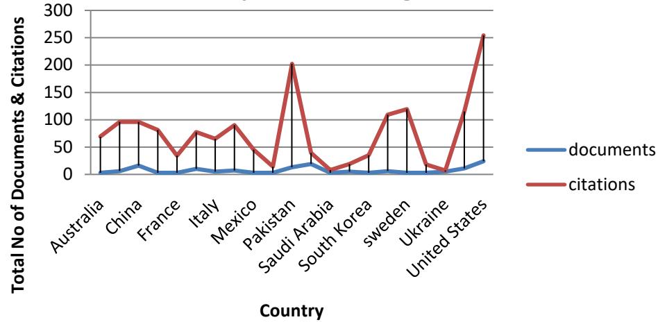 <table><tr><td>Country Name</td><td>Total Documents</td><td>Citations</td><td>Total link Strength</td></tr><tr><td>United States</td><td>24</td><td>254</td><td>27</td></tr><tr><td>Russia</td><td>19</td><td>39</td><td>0</td></tr><tr><td>China</td><td>16</td><td>96</td><td>6</td></tr><tr><td>Pakistan</td><td>13</td><td>202</td><td>7</td></tr><tr><td>United kingdom</td><td>11</td><td>115</td><td>7</td></tr><tr><td>India</td><td>10</td><td>77</td><td>4</td></tr><tr><td>Malaysia</td><td>7</td><td>90</td><td>5</td></tr><tr><td>Canada</td><td>6</td><td>96</td><td>2</td></tr><tr><td>Spain</td><td>6</td><td>109</td><td>9</td></tr><tr><td>Italy</td><td>5</td><td>65</td><td>9</td></tr><tr><td>South Africa</td><td>5</td><td>19</td><td>0</td></tr><tr><td>Ukraine</td><td>5</td><td>7</td><td>1</td></tr><tr><td>Australia</td><td>3</td><td>69</td><td>4</td></tr><tr><td>Finland</td><td>3</td><td>81</td><td>4</td></tr><tr><td>France</td><td>3</td><td>34</td><td>0</td></tr><tr><td>Mexico</td><td>3</td><td>45</td><td>0</td></tr><tr><td>Norway</td><td>3</td><td>14</td><td>2</td></tr><tr><td>Saudi Arabia</td><td>3</td><td>8</td><td>3</td></tr><tr><td>south Korea</td><td>3</td><td>35</td><td>8</td></tr><tr><td>Sweden</td><td>3</td><td>119</td><td>2</td></tr><tr><td>Taiwan</td><td>3</td><td>18</td><td>1</td></tr></table>