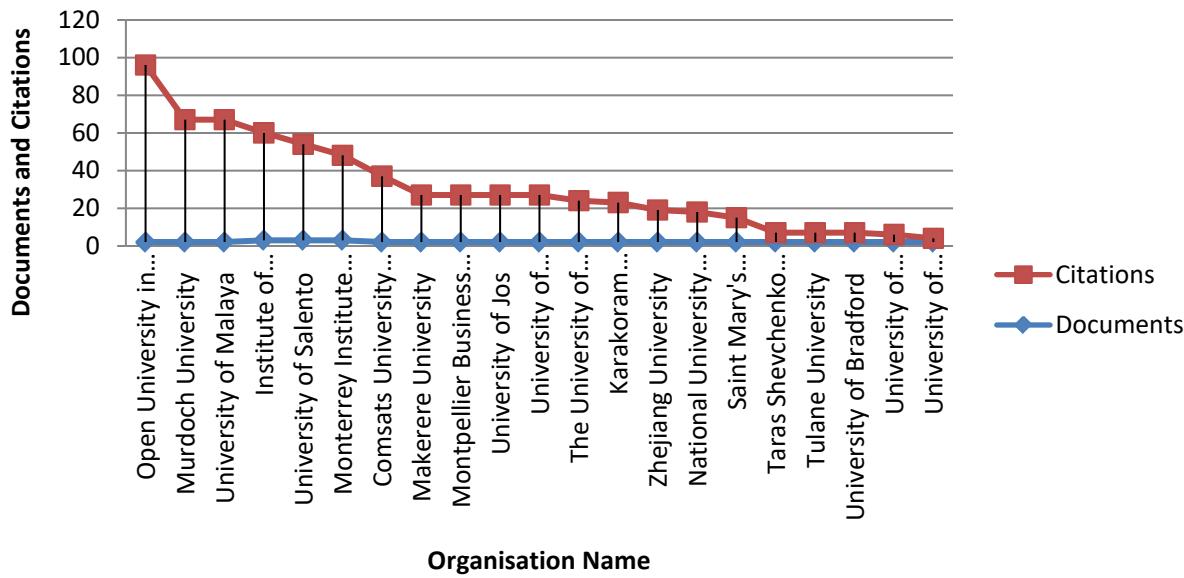 <table><tr><td>Organization</td><td>Documents</td><td>Citations</td><td>Total link strength</td></tr><tr><td>Open University in The Netherlands</td><td>2</td><td>94</td><td>0</td></tr><tr><td>Murdoch University</td><td>2</td><td>65</td><td>0</td></tr><tr><td>University of Malaya</td><td>2</td><td>65</td><td>1</td></tr><tr><td>Institute of Management Technology</td><td>3</td><td>57</td><td>1</td></tr><tr><td>University of Salento</td><td>3</td><td>51</td><td>0</td></tr><tr><td>Monterrey Institute of Technology and Higher Education</td><td>3</td><td>45</td><td>0</td></tr><tr><td>Comsats University Islamabad</td><td>2</td><td>35</td><td>0</td></tr><tr><td>Makerere University</td><td>2</td><td>25</td><td>4</td></tr><tr><td>Montpellier Business School</td><td>2</td><td>25</td><td>0</td></tr><tr><td>University of Jos</td><td>2</td><td>25</td><td>4</td></tr><tr><td>University of Southampton</td><td>2</td><td>25</td><td>4</td></tr><tr><td>The University of Texas at Dallas</td><td>2</td><td>22</td><td>0</td></tr><tr><td>Karakoram International University</td><td>2</td><td>21</td><td>0</td></tr><tr><td>Zhejiang University</td><td>2</td><td>17</td><td>1</td></tr><tr><td>National University of Malaysia</td><td>2</td><td>16</td><td>2</td></tr><tr><td>Saint Mary's University</td><td>2</td><td>13</td><td>0</td></tr><tr><td>Taras Shevchenko National University of Kyiv</td><td>2</td><td>5</td><td>1</td></tr><tr><td>Tulane University</td><td>2</td><td>5</td><td>0</td></tr><tr><td>University of Bradford</td><td>2</td><td>5</td><td>0</td></tr><tr><td>University of Technology Malaysia</td><td>2</td><td>4</td><td>0</td></tr><tr><td>University of Massachusetts Dartmouth</td><td>2</td><td>2</td><td>0</td></tr><tr><td>Organization</td><td>Documents</td><td>Citations</td></tr><tr><td>Open University in The Netherlands</td><td>2</td><td>94</td></tr><tr><td>Murdoch University</td><td>2</td><td>65</td></tr><tr><td>University of Malaya</td><td>2</td><td>65</td></tr><tr><td>Institute of Management Technology</td><td>3</td><td>57</td></tr><tr><td>University of Salento</td><td>3</td><td>51</td></tr><tr><td>Monterrey Institute of Technology and Higher Education</td><td>3</td><td>45</td></tr><tr><td>Comsats University Islamabad</td><td>2</td><td>35</td></tr><tr><td>Makerere University</td><td>2</td><td>25</td></tr><tr><td>Montpellier Business School</td><td>2</td><td>25</td></tr><tr><td>University of Jos</td><td>2</td><td>25</td></tr><tr><td>University of Southampton</td><td>2</td><td>25</td></tr><tr><td>The University of Texas at Dallas</td><td>2</td><td>22</td></tr><tr><td>Karakoram International University</td><td>2</td><td>21</td></tr><tr><td>Zhejiang University</td><td>2</td><td>17</td></tr><tr><td>National University of Malaysia</td><td>2</td><td>16</td></tr><tr><td>Saint Mary's University</td><td>2</td><td>13</td></tr><tr><td>Taras Shevchenko National University of Kyiv</td><td>2</td><td>5</td></tr><tr><td>Tulane University</td><td>2</td><td>5</td></tr><tr><td>University of Bradford</td><td>2</td><td>5</td></tr><tr><td>University of Technology Malaysia</td><td>2</td><td>4</td></tr><tr><td>University of Massachusetts Dartmouth</td><td>2</td><td>2</td></tr></table>