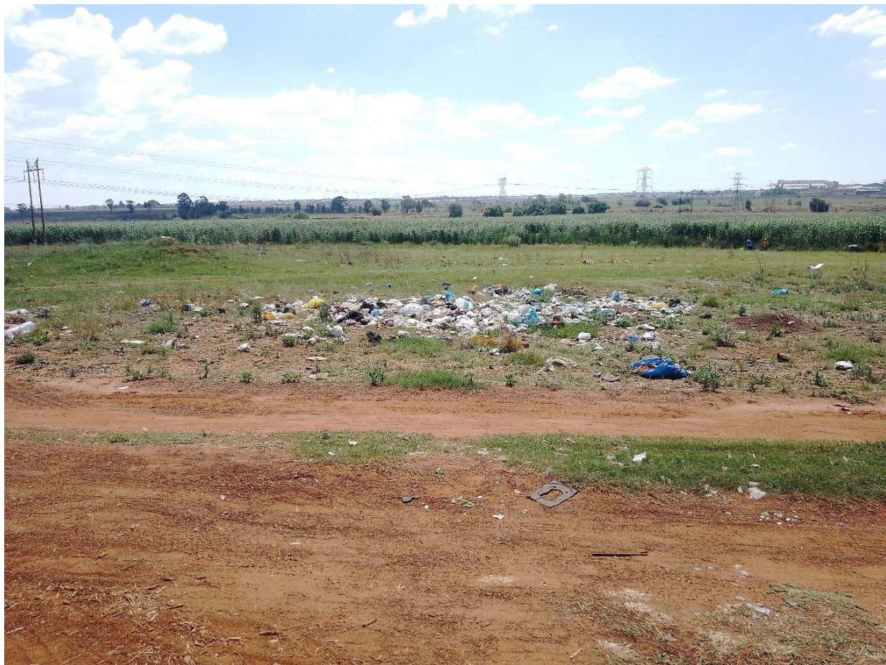 In 2022, backyard tenants from around Mogale, Mohlakeng, Roodepoort and Soweto began to erect shacks on the south-west of Swanieville 1, east of extension 2 and 3. Others occupied the land west of extension 2 and 3. All these flow from inadequate provision of proper housing in Mogale City, Johannesburg Metro, and Rand West City Local Municipality and some of the surrounding townships and informal settlements caused by over-population due urban migration as people look for better opportunities in the cities. Turok & Borel-Saladin (2016) adds that many poor people in Gauteng Province live in shacks. It is not surprising that the two pieces of land were occupied in 2023. The pieces of land are on a hill and slopes from south-west of Swanieville 1, east of extension 2 and 3 to the stream running in the valley between the areas (see formal settlement at the back and illegal settlements near the stream and reeds at foreground of picture 1). Mogale City does not provide refuse collection on these pieces of land. This lack of service results in littering and illegal dumping.