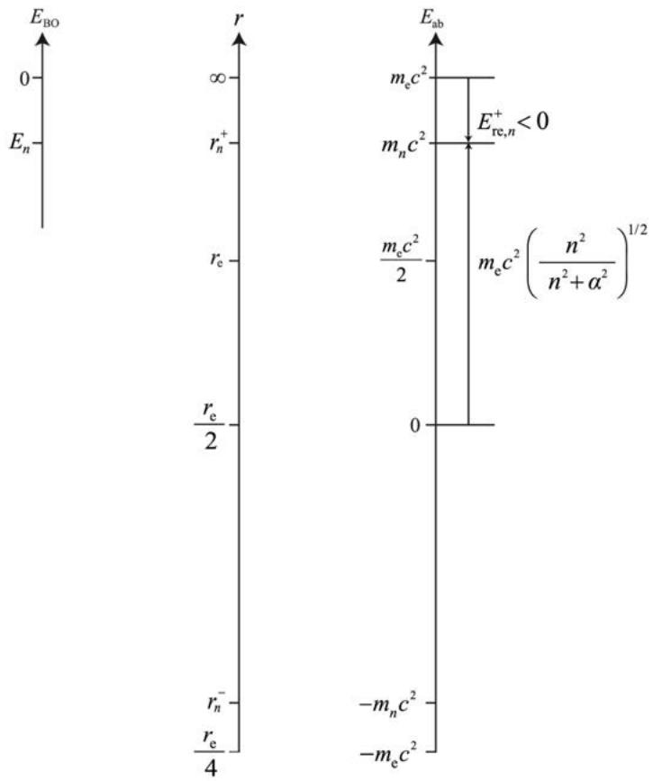 $E_{\mathrm{re},n}$ are the energy levels when $m_{\mathrm{e}}c^{2}$ is taken to be the energy of an electron at rest at a position infinitely far from a proton. The relationship of $E_{\mathrm{ab},n}$ and $E_{\mathrm{re},n}$ is as follows.