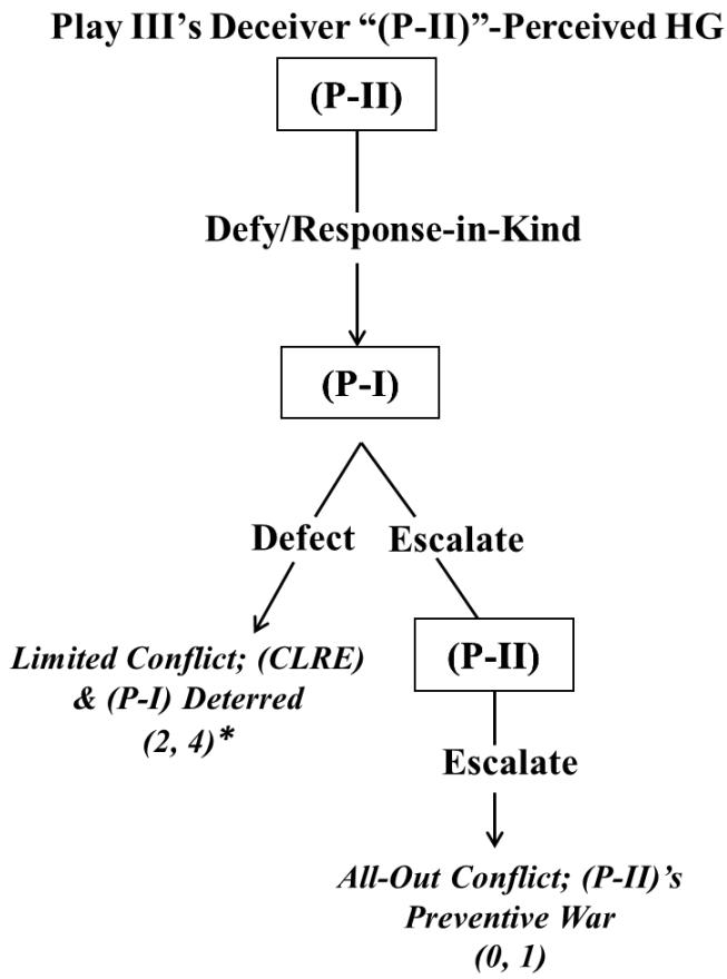 - A possible sequential "non-rational choice" may take place when (P-II) picks the (Defy/Response-in-Kind) action in Play III. That is, (P-I)'s moving to (Escalate "first") preference of probability: $(0 \leq p < 1)$, considering that this player chose to (Defect) first in Play II. Therefore, the rational choice for (P-II) is to (Counter- Escalate/Escalate) where $(0.5 < p \leq 1)$ and the outcome "All-Out Conflict; (P-II)'s Preventive War" occurs; simultaneously, the payoffs become: $(0,1)$.