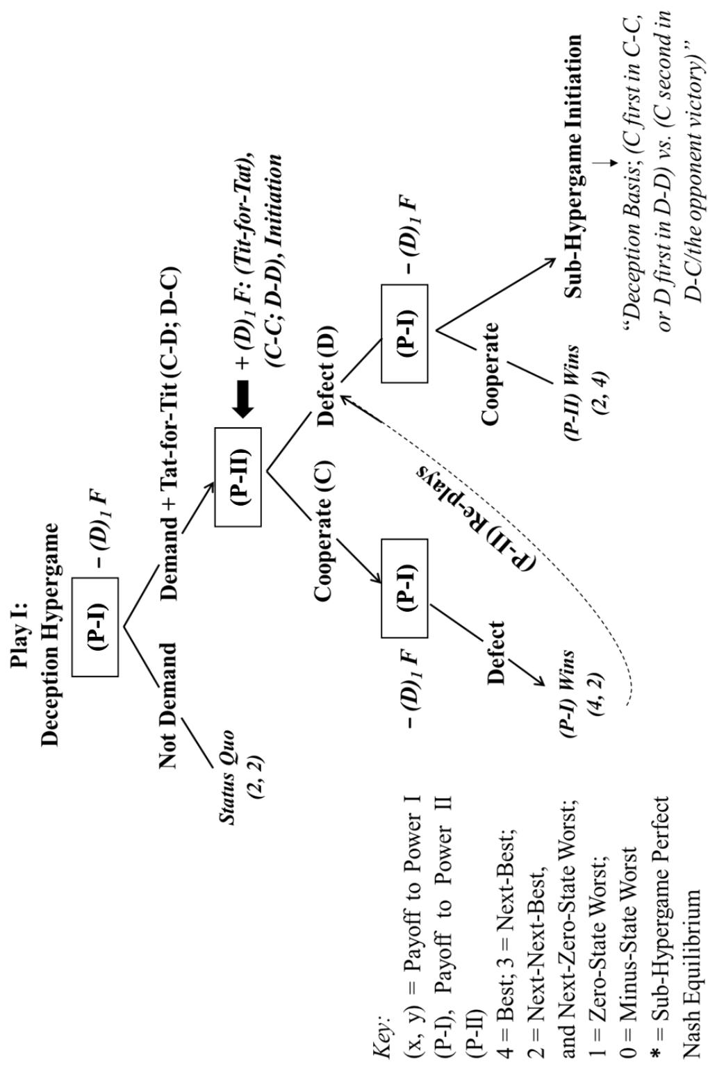Under this hypergame model, (Power II) can never reveal the Deception Factor $\{+(D)F\}$ but makes its choices with existing certain uncertainty about (Power I)'s actual actions and moves or its real played-game the player who started the deception hypergame. Namely, this model simulates real-world circumstances of conflict interstate under different information, beliefs, perceptions, understandings, and interpretations conditions. Within these actual interactions, the (Power I)'s strategic preference vector includes not only the actions perceived in its understood hypergame but also, it is composed of a more diverse set of strategic actions. These are: "Not Demand); (Demand $^+$ Tat-forTit C-D; D-C); Defect DCooperate C) Conditional Cooperation CC) (Cooperate Only) Defect Only); (Escalate)." Likewise, (Power II)'s set of strategic preferences is consisted of: "Cooperate (C); Defect DConditional Cooperation CC) (Cooperate Only); (Defy/Response-in-Kind); (Escalate); (Defy Only/Retreat)" actions. In each play, the arrow drawn at a node's end refers to the rational choice preferred to the other for a given player at that move. Sometimes two reasonable actions at the same move become preferredunder different conditions explained.