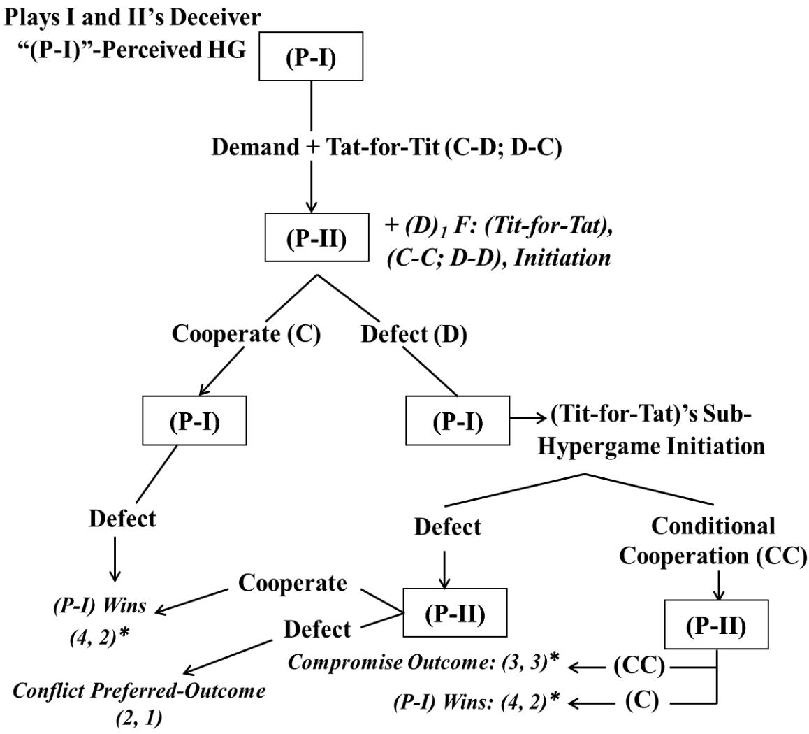 $(\text{Demand}); (\text{Defect}" \, D" \, in \, the \, Tat-for-Tit); (\text{Conditional Cooperation/Cooperation}" \, CC/C" \, in \, the \, Tit-for-Tat); \, and \, (\text{Defect in the} \, \text{Tit-for-Tat})$. Here, the (Tat-for-Tit) and (Tit-for-Tat) strategies are borrowed from the Decision Theoretic-Deterrence Theory to be used differently in sequential-move multiple games. Both players choose to cooperate, or all prefer to defect in the (Tit-for-Tat) strategy; that is what we refer to as: (C-C; D-D). Rather, one player cooperates, and the other defects, and vice versa, in the (Tat-for-Tit) strategy, which we denoted as: (C-D; D-C). Within this perceived hypergame, (P-I) understands that (P-II) has a preference vector consisting of a. (Cooperate), b. (Defect), and c. (Conditional Cooperation) actions under the (Tit-for-Tat) strategy.