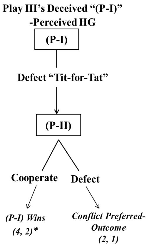 - In a sequential move, (P-I) chooses its second-perceived rational choice in "Play I," that is: (Defecting) where $(p = 1)$, after deceiving (P-II) about its actual moves or the game played. So, the "(P-I) Wins" outcome occurs out of the (Cooperate, Defect) used strategies _ where the first is made in a (Tit-for-Tat) misperceived game by (P-II) while the second is made in a deceiving (Tat-for-Tit) one by (P-I).