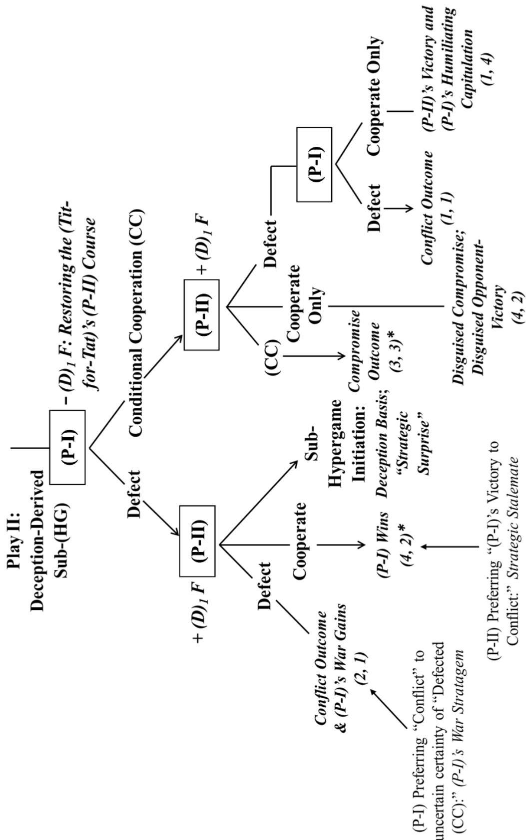 - (P-II) reasoning that (P-I) is better off by the (Compromise Outcome) if it picked a cooperation choice sequentially may move to the (Defect) action instead, where $(0 \leq p < 0.5)$. However, (P-II) makes a risky choice, perceiving that it maximizes the expected utility of the game using the (Tat-for-Tit) strategy rather than the (Tit-for-Tat) one. At the same time, (P-II) is still deceived due to the Deception Factor's impact of "Play I" or the $(+D)1F$, while acquiring no (correct) information for revealing the deception, and still not having a knowledge that there is a hypergame being played or that it has misperceptions in the game. So, with (P-II) understanding that it leaves, but only one rational choice to (P-I) to move to (i.e., the (Cooperate) action) in a sequence, (P-II) gives (P-I) under this interaction-track the impulse to go to conflict, alternatively.