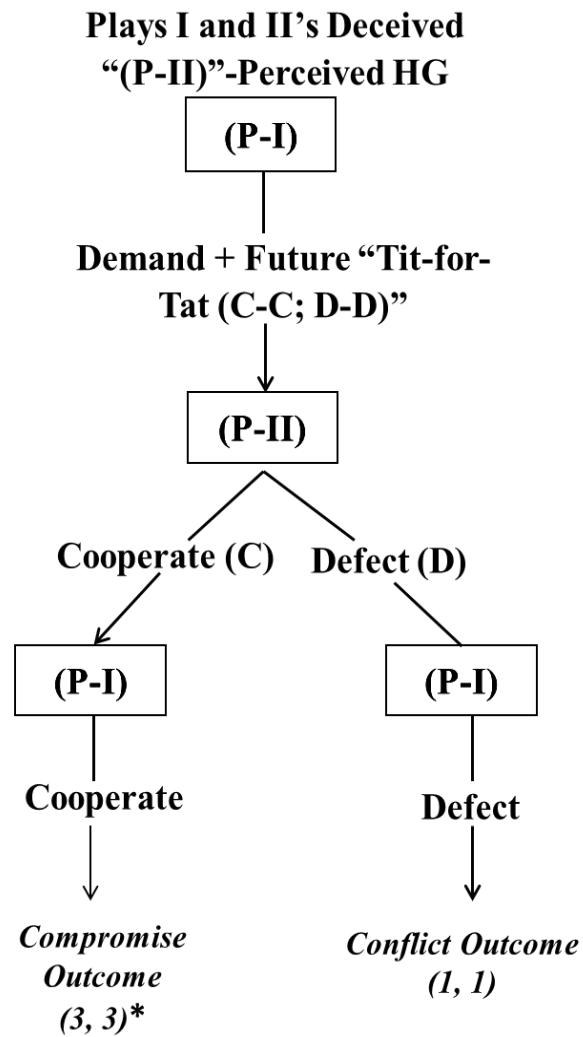 - Being deceived in the game _ by considering the lack of (correct) information about (P-I)'s actual beliefs and perceptions, (Power II) or (P-II) moves to the (Cooperate) action sequentially. That is the (P-II)'s perceived rational choice, expecting the "Compromise Outcome" equilibrium to occur instead of a would-be ensuing conflict situation if both defect under a (misperceived) (Tit-for-Tat)-strategy.