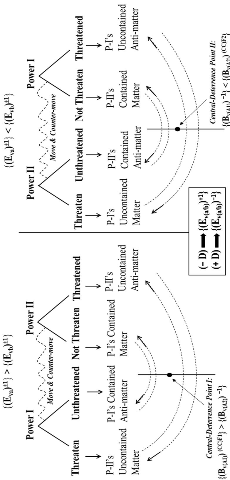 - {Threaten Threatened} and {Not Threaten Unthreatened} subcases. Obviously, those relations are not about: {(Threaten, Threaten); (Not Threaten, Not Threaten); (Threatened, Threatened); or (Unthreatened, Unthreatened)} strategic preferences of two actors/ powers of the system if a conflict exists. Thus, the modeling defines (Deterrence Entanglement Law) thorough cases for the conflict/war impediment purpose _ when a movement of moves and its opposite movement in the same direction of countermoves address an observed context of conflict interstate and/or deterrence relation. Therefore, the (DEL) does not focus on the interactive decision-making's possible strategic actions of separate situations in a conflict, which is considered a general law for conflict management through governing the conflict/war impediment possibilitiesand equilibria first. e. The first (Matter and Anti-matter), as well as the second, reflect two different (Threat Objects), existing in opposite ways of the same direction, that must be equivalently equal in "level" and/or "scale." Based on that, a "deterrence sufficiency" condition in line with the "(Threat Objects) capability and credibility criteria" becomes partially or entirely fulfilled for reaching a state of balance of an "Initial Stability in (the System) Powers' Conflict and Deterrence Relation (ISPCDR)."